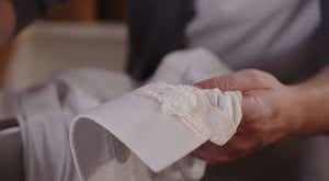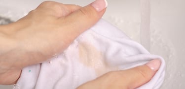 No importa si la tela manchada es una blusa blanca, una sábana de lino o una toalla de baño, primero revise la etiqueta de cuidado para asegurarse de que la prenda se pueda lavar a mano y verifique la temperatura recomendada del agua.